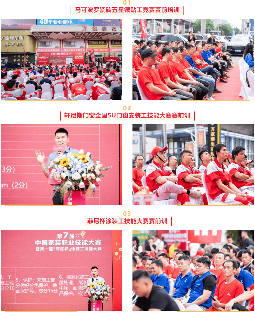 本次大赛涵盖了马可波罗瓷砖五星镶贴工大赛、轩尼斯门窗全国5U门窗安拆工技术大赛、菲尼杯涂拆工技术大赛、法恩莎卫浴卫生间焕新表演赛多项专业竞赛。展现了家拆行业正在手艺和工艺方面的最新进展。