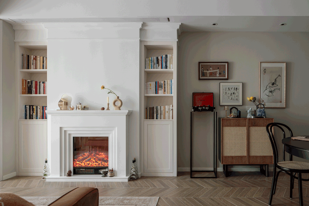 壁炉和书柜的设想替代了电视墙的设想。