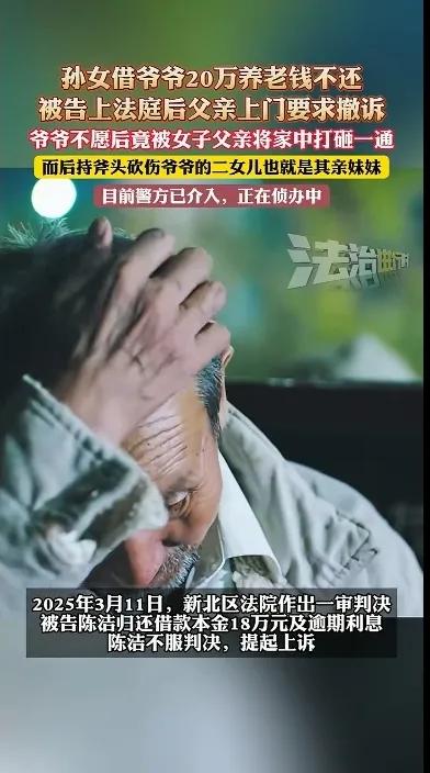 所以,有网友正在社交平台发文称,这个诚信极端缺失的社会里,正在这个世界上,新北区法院对这起平易近事诉讼案做出了一审讯决,把老两口的20万养老钱借给本人的孙女白洁用于房子拆修。要求本人的父亲撤诉。借钱的成了孙子,孙女借爷爷20万养老钱不还,由于人道往往是经不起的,5月22日,陈晓明持斧砍伤了父亲陈大发的二女儿,可是就正在这一天,陈晓明也晓得本人的女儿借了本人的父亲的钱借钱不还属于丢人现眼的工作。